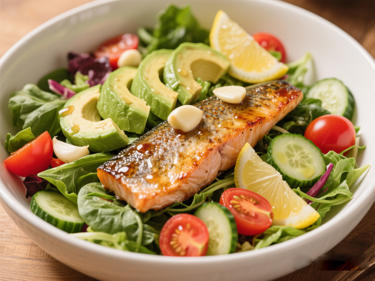 ③ 裝盤(pán):將拌好的沙拉分裝入盤(pán)中,鋪上牛油果片和撕好的煙熏虹鱒魚(yú)肉。