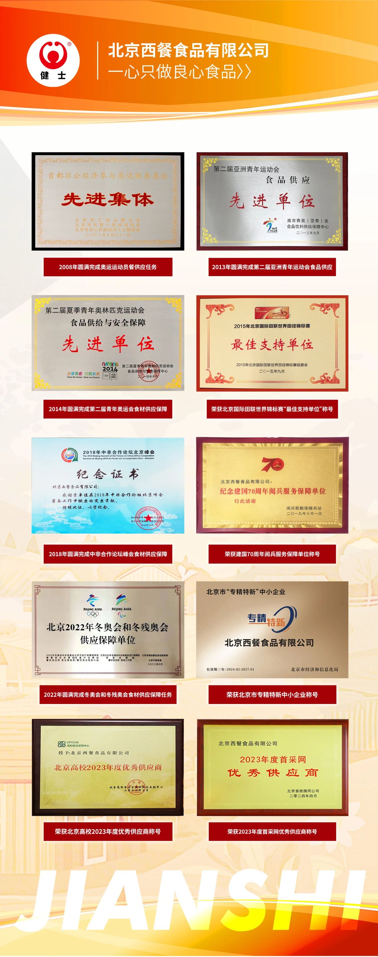 作為北京市高新技術企業(yè)、北京市農(nóng)業(yè)產(chǎn)業(yè)化龍頭企業(yè)、北京市專精特新中小企業(yè)以及北京市創(chuàng)新型中小企業(yè),公司通過 HACCP、FSSC22000 等國際體系認證,憑借 “健士” 品牌的卓越口碑,連續(xù)服務北京奧運會、冬奧會、一帶一路高峰論壇等40余項國家級重大活動,以零事故的保障記錄贏得贊譽。