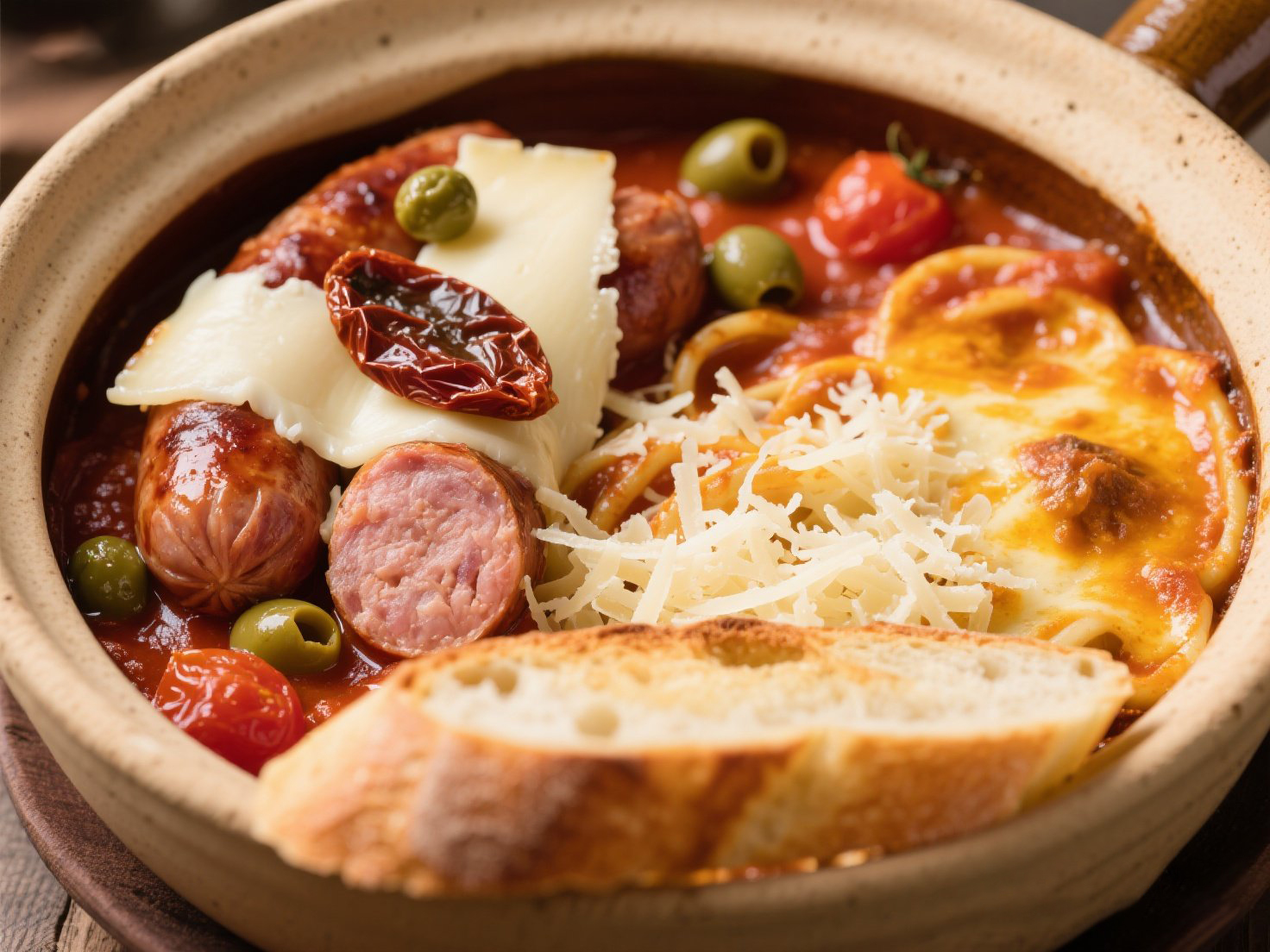裝盤藝術:深盤墊烤脆面包片 → 舀入燉鍋連汁 → 擦帕瑪森芝士屑