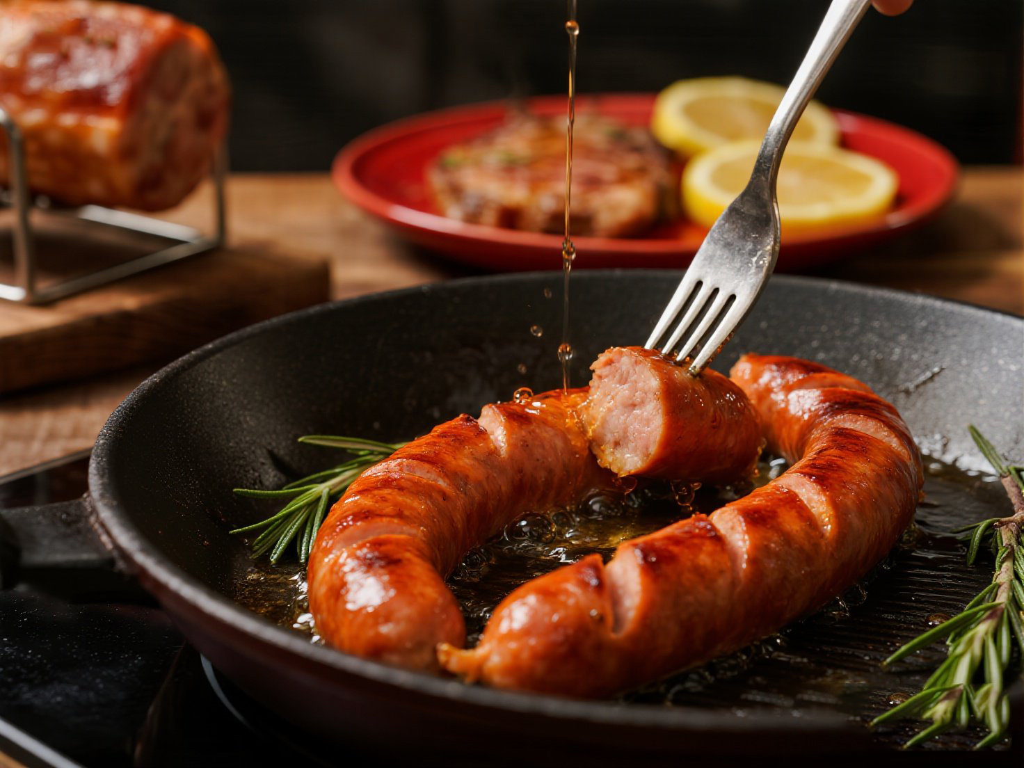 ①冷鍋刷油,放入香腸,兩面煎至焦黃,加入少許水,蓋上鍋蓋水煎,小火慢煎8分鐘左右,直至熟透 → ②香腸切段擠上檸檬汁,開吃!