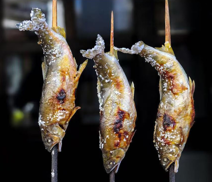 ◎爐端燒,現(xiàn)場烤制的虹鱒魚,散發(fā)著陣陣鮮香,魚肉鮮嫩多汁,口感細(xì)膩,一把鹽,一把火,吃魚最原始的味道!