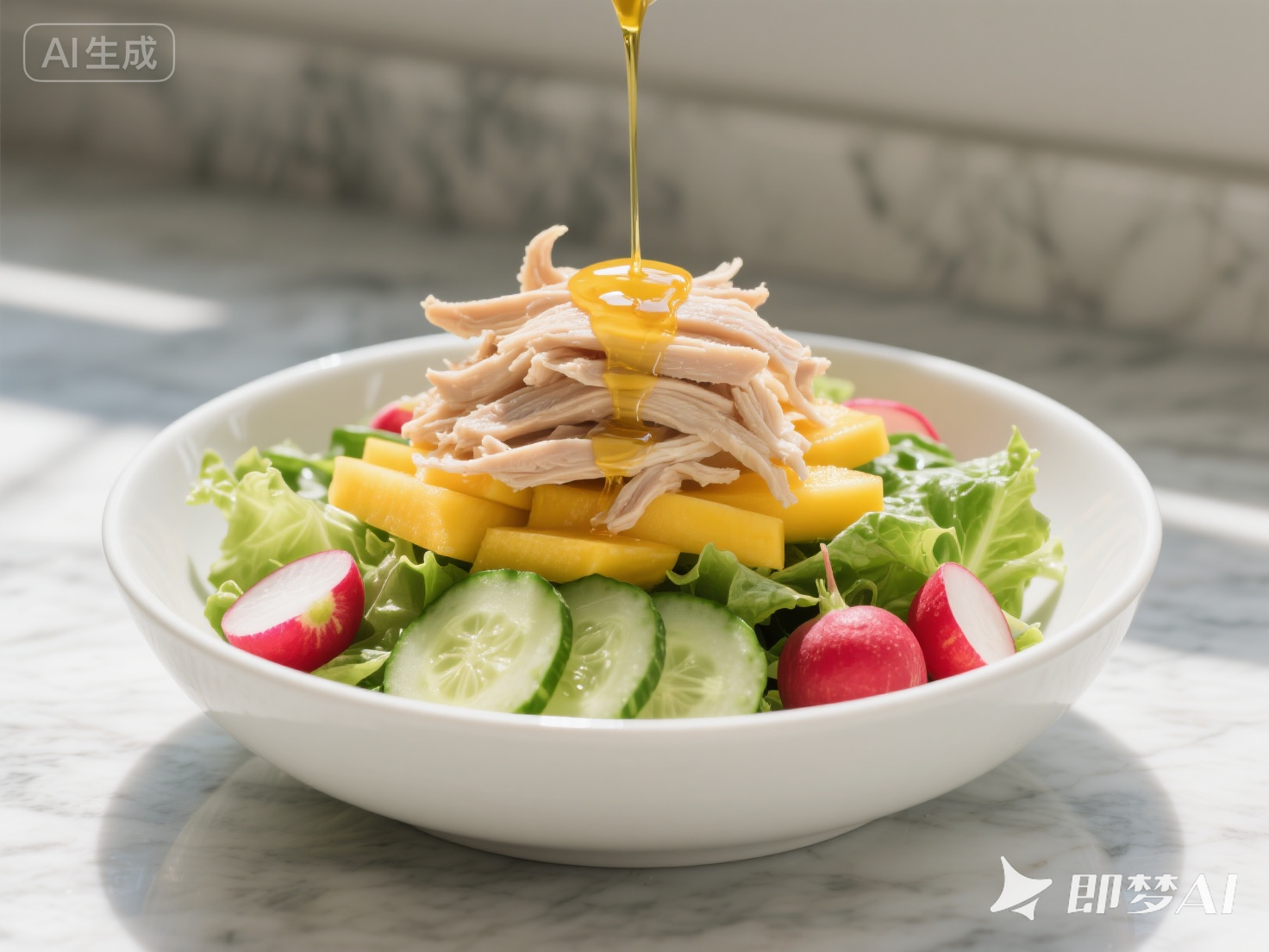 ④ 組合裝盤(pán):將混合生菜鋪在盤(pán)底,依次碼上黃瓜片、櫻桃蘿卜片、芒果條,最后撒上撕好的鹽水鴨絲。